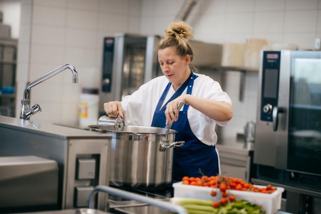 Unser Küchenteam legt großen Wert auf abwechslungsreiches und schmackhaftes Essen. Wir achten in unserem Haus auf eine frische, gesunde und ausgewogene Ernährung, die sich an den Bedürfnissen und Wünschen unserer Bewohner*innen orientiert. Um Ressourcen und die Umwelt zu schonen, beziehen wir einen Großteil unserer Lebensmittel regional, verwenden soweit wie möglich Mehrwegbehälter und vermeiden Überproduktionen. Wir bieten Ihnen immer ein Fleischgericht und eine vegetarische Alternative an. Gern nehmen wir auch Rücksicht auf individuelle Unverträglichkeiten.